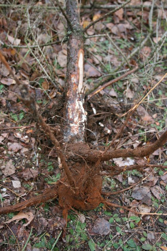 Po wyrwaniu drzewek z przebarwieniami, stwierdzono zdeformowany system korzeniowy, redukcję korzenia palowego, guzowatość oraz zawinięte korzenie boczne (wykluczono błędy sadzenia). Ponadto u części drzewek stwierdzono wielopędowość (brak jednego, głównego przewodnika), drzewka przyjmują formę krzaczastą (jak kosodrzewina). Na kilku egzemplarzach stwierdzono białą grzybnię oraz ryzomorfy opieńki Armillaria spp , której aktywność wzmogła się przez brak wody. Zdecydowana większość drzewek na uprawie posiada jeden garnitur igieł.