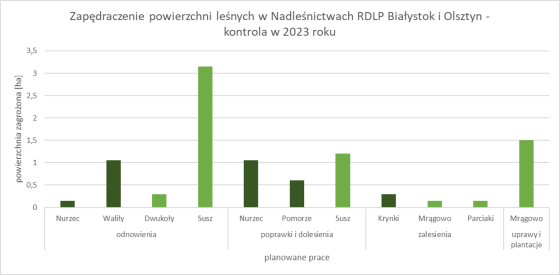 W sąsiedniej dyrekcji w dwóch nadleśnictwach odnotowano obecność miernikowców – Łomża oraz Maskulińskie (łącznie 75 ha). W N. Łomża jest zagrożenie oraz występowanie wzmożone po 25 ha. W N. Maskulińskie zagrożenie również na poziomie 25 ha.