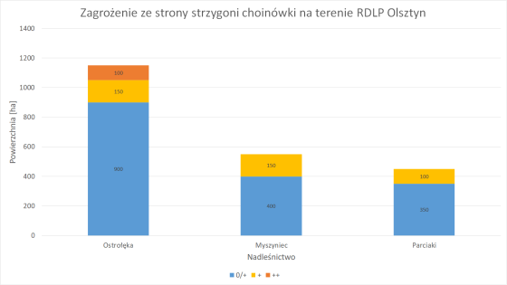 W tym roku największe zagrożenie znajduje się w Nadleśnictwie Parciaki (łącznie 2,8 tys. ha). Jest to także jedyne nadleśnictwo, które posiada każdy rodzaj zagrożenia (od ostrzegawczego do silnego).