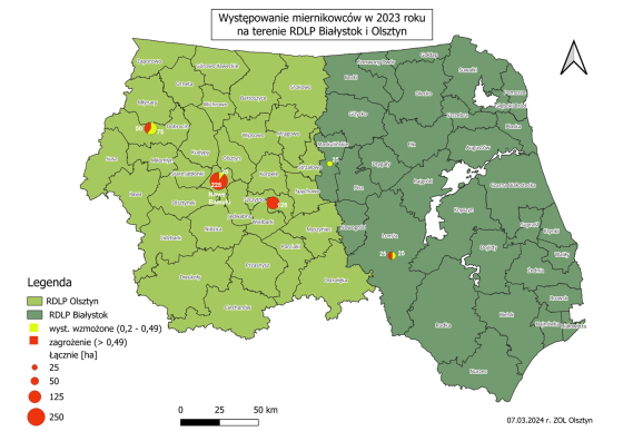 Występowanie wzmożone oraz zagrożenie w RDLP Olsztyn ze strony miernikowców wynosi łącznie 500 ha. Największe zagrożenie znajduje się w Nadleśnictwie Nowe Ramuki – 225 ha. Na drugim miejscu jest N. Szczytno – 125 ha. Natomiast w N. Dobrocin przeważa występowanie wzmożone – 75 ha, a zagrożenie zostało określone na 50 ha.