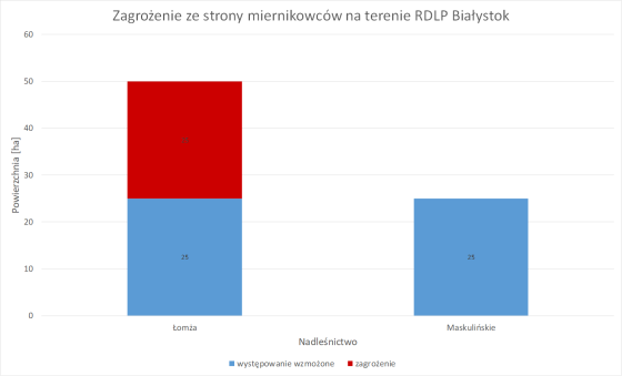 W sąsiedniej dyrekcji w dwóch nadleśnictwach odnotowano obecność miernikowców – Łomża oraz Maskulińskie (łącznie 75 ha). W N. Łomża jest zagrożenie oraz występowanie wzmożone po 25 ha. W N. Maskulińskie zagrożenie również na poziomie 25 ha.